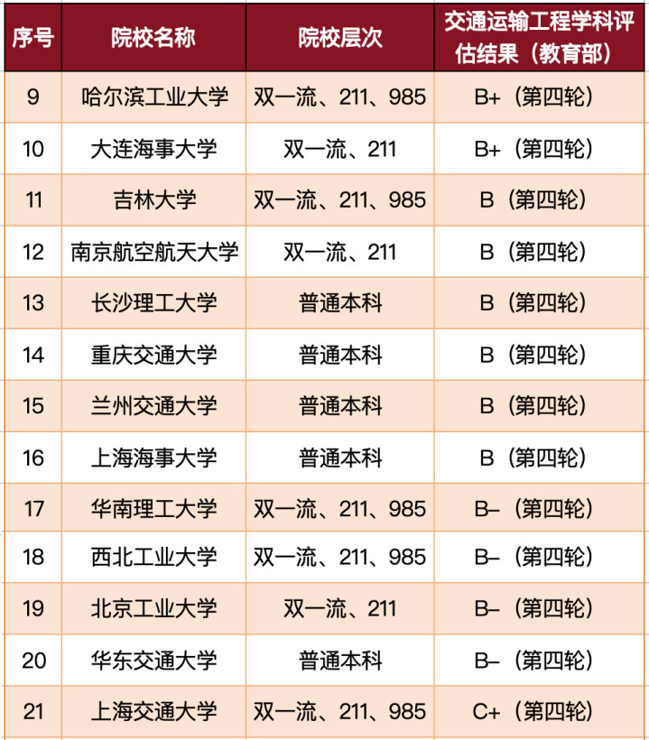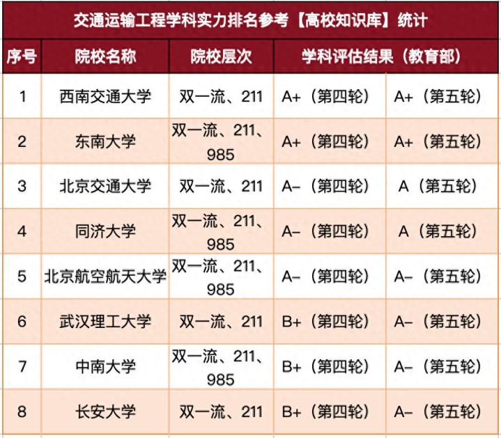 教育部第五轮学科评估未向社会公开,但根据各校透露以及参考网络信息,已统计有8所大学的交通运输工程学科获评A类。其中西南交大、东南2校在教育部第五轮学科评估中获评A+,并列第一。
