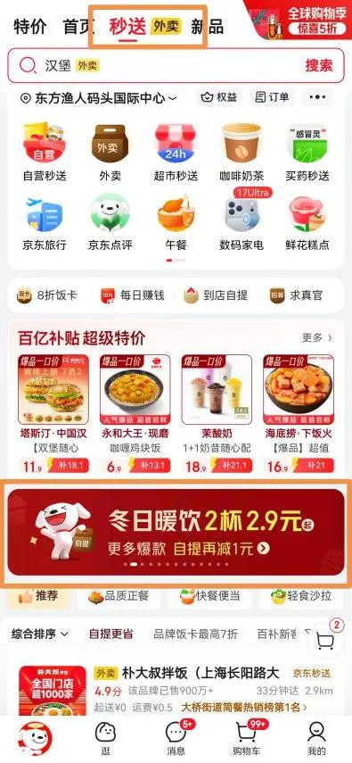 “京东自提”依托京东平台生态,联动全国数万家连锁餐饮品牌,消费者在京东App秒送频道或京东外卖App选购商品时,可选择“到店自提”选项,完成支付后按约定时间前往门店取货,全程无需等待骑手配送。该模式不仅免去配送费用,爆品平均节省3–8元/单,还大幅缩短履约时间——热门门店商品最快5分钟即可备妥。
