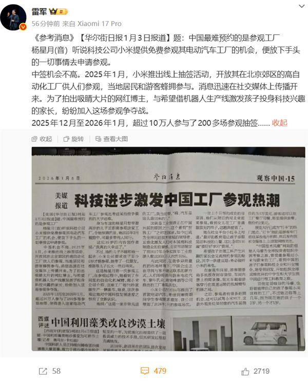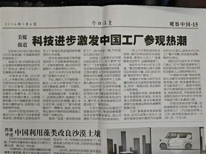 今日,《参考消息》援引美国媒体消息以《科技进步激发中国工厂参观热潮》为题对小米工厂开放参观引发民众参与进行了报道。