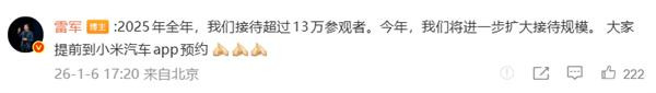 随后,雷军在微博上进行了转发。他表示:“2025年全年,我们接待超过13万参观者。今年,我们将进一步扩大接待规模。 大家提前到小米汽车app预约。”