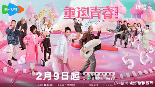 又如2月9日在腾讯视频独播的都市情景喜剧《重返青春》集结了李诚儒、许娣、蔡明、范明、梁天等中老年国民演员,由开心麻花团队与英达联合摄制,围绕6名大学生在养老社区实习并与老人成为“忘年交”的经历展开。
